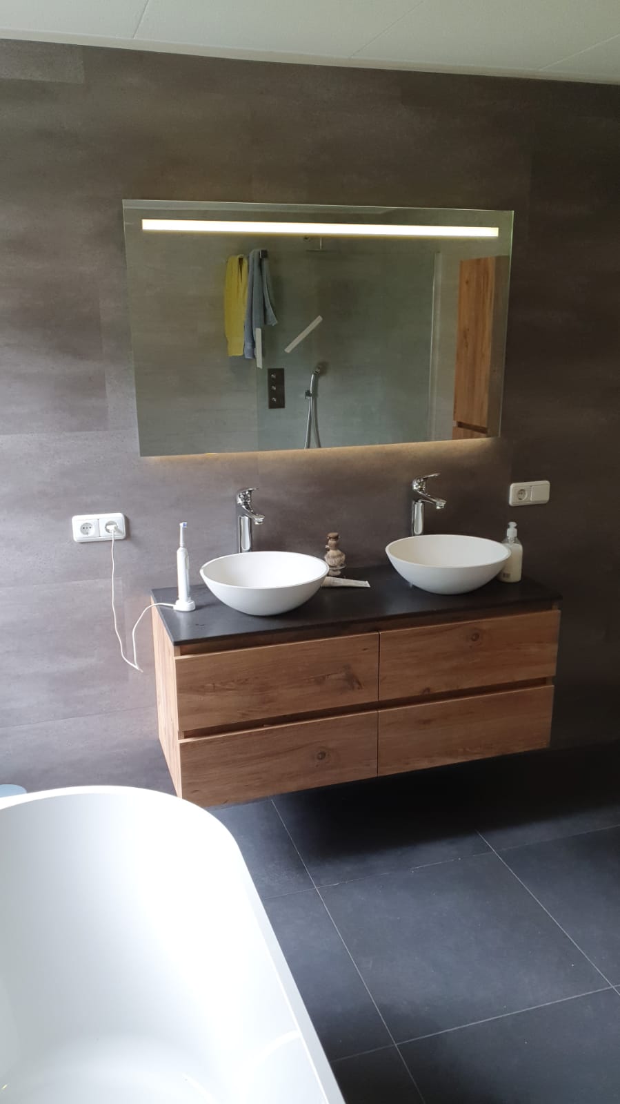 MURO waterproof wall tiles give the interior a sleek look. The tiles are placed horizontally and can be mounted infinitely high.